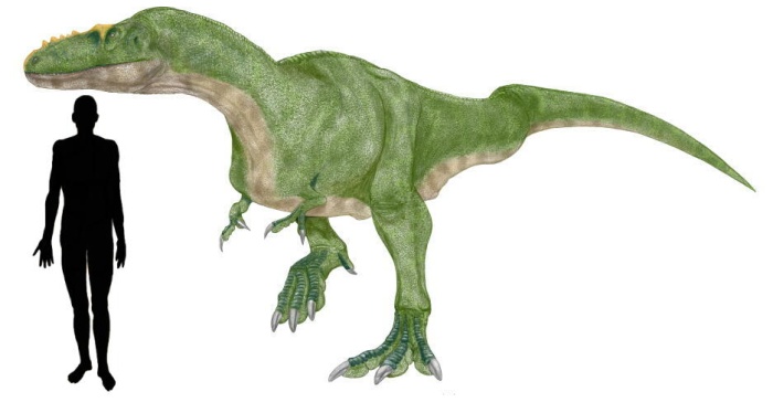 Medía 6 metros de longitud. Era uno de los tiranosaurios más extraños. El gigantesco Tyrannosaurus y muchos otros miembros de su familia tenían la cabeza enorme y el hocico corto. Sin embargo, tenía la cabeza larga y estrecha, con una hilera de cuernos en el hocico, fuera de lo corriente. Los tiranosaurios fueron los mayores carnívoros terrestres que han existido. Hasta ahora se han encontrado aproximadamente una docena de tipos distintos. Tenía afilados dientes curvos, ideales para cortar carne.