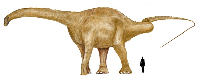 Sus patas traseras eran ligeramente más largas que las delanteras, por lo que la zona posterior del cuerpo quedaba más elevada que la anterior. Si alguna vez le amenazaba algún carnívoro, su única defensa hubiera consistido en su larguísima y fustigante cola, cimbreante como un látigo. La larga cola se iba estrechando hasta el final terminando en unos finos huesecillos como pequeños cilindros. La cola en total tenía 73 huesos. Un golpe certero con esta cola tuvo que ser terrible para el enemigo. Su cuerpo estaba preparado para soportar y desplazar un peso enorme, y la espina dorsal, entre hombros y caderas, era el centro energético de todo el animal.