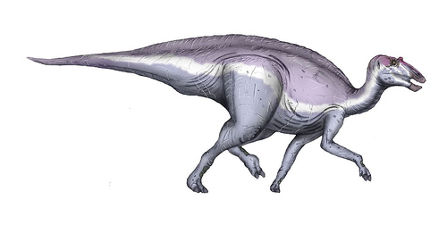 Tenía anchas hileras sin dientes, que se afilaban solos, para cortar y triturar vegetación dura. Los hadrosaurios probablemente viajaban en grandes grupos, llenándose el pico con bocados de plantas mientras avanzaban. Aunque en 1923 sólo se encontró en Argentina la parte posterior del cráneo, bastó para mostrar a los científicos que, a diferencia de otros de sus parientes, carecía de cresta; y que quizá se parecía al del Probactrosaurus. Quizá tuviera una bolsa de piel en el hocico. Cuando bramaba, hinchaba la bolsa, que actuaba como caja de resonancia, y amplificaba el sonido. Imagina todo un grupo de dinosaurios llamándose al amanecer, formando un coro ensordecedor.