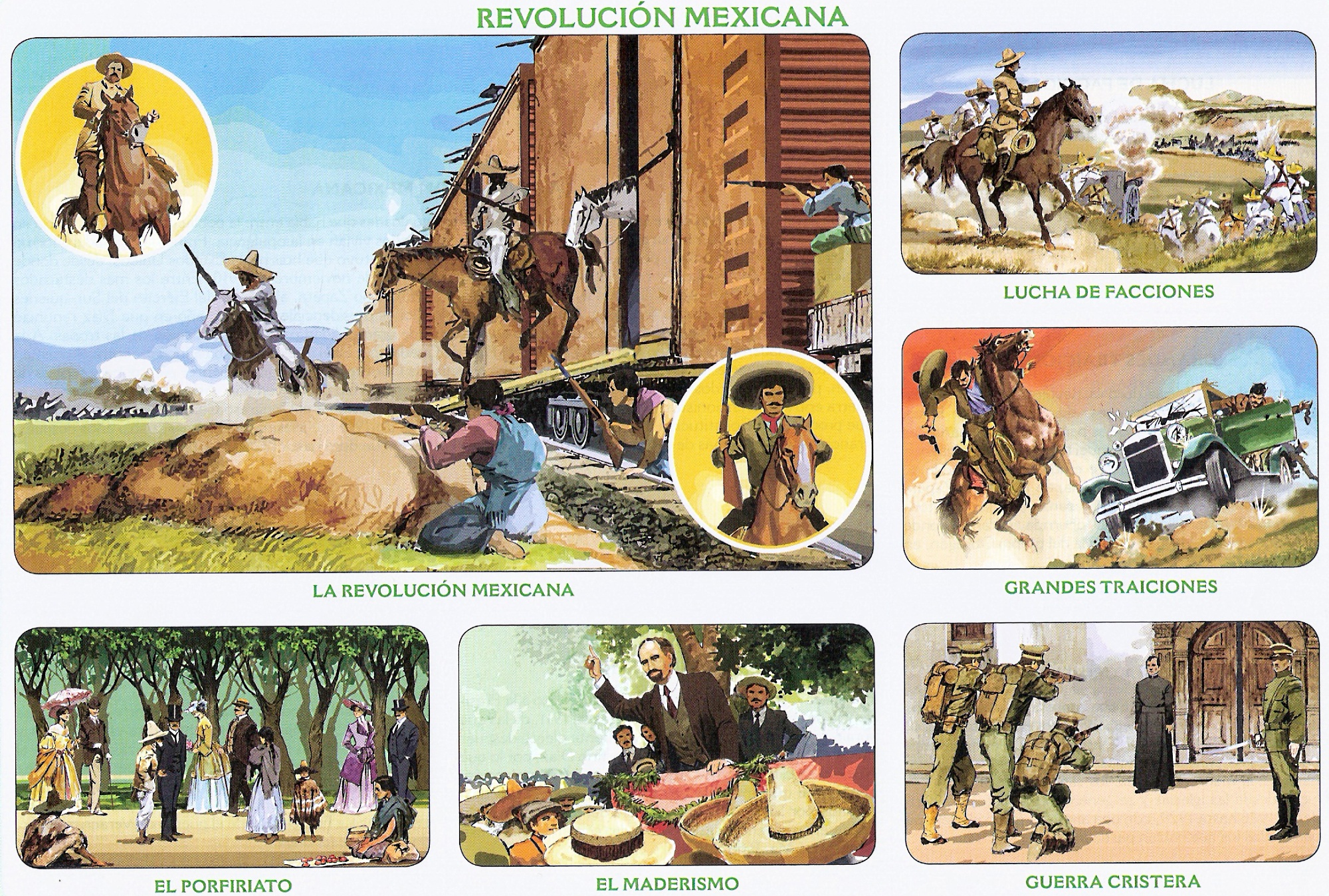 Fue un conflicto armado entre los mexicanos debido a las desigualdades que había entre la población, pues la estancia en el poder de Porfirio Díaz había generado mucha miseria y muy pocos vivían en la opulencia. Francisco I. Madero formó el Partido Antirreelecionista, por lo que Díaz lo apresó pero escapó y tuvo que huir hacia Estados Unidos, desde donde publicó el Plan de San Luis y convocó a levantarse en armas el 20 de Noviembre de 1910. Entre los más destacados líderes estuvieron Francisco Villa, con la División de l Norte y Emiliano Zapata, al mando del Ejército del Sur, quienes contendían con las tropas federales. Madero ganó las elecciones presidenciales en 1911, año en que Díaz renunció y salió del país. En la Revolución Mexicana los trenes fueron de gran utilidad para la movilización de las tropas. A la muerte de Madero, Venustiano Carranza publicó el Plan de Guadalupe, en el que convoca a luchar contra el régimen de Victoriano Huerta, quien huyó del país. Carranza organizó la Convención de Aguascalientes para poner un poco de orden, pero los acuerdos no fueron de su agrado y terminó desconociendo la Convención. Así que se inició otra etapa de la guerra entre convencionalistas y constitucionalistas. En 1916 empezó a sesionar el Congreso Constituyente de Querétaro que promulgó la Constitución de 1917. Pero la violencia continuó. En 1919 fue asesinado Zapata y cuatro años después, Francisco Villa. Además de eso, en 1926 estalló la guerra Cristera, que duró hasta 1929.