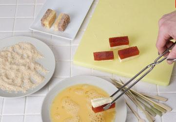 Ensartar un trozo de queso y un trozo de membrillo con un palillo, pasarlos por huevo batido y pan rallado y freírlo en abundante aceite.