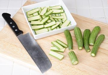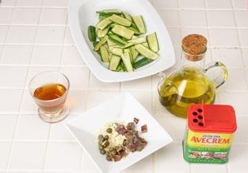 Lavar las calabazas, despuntarlos y cortarlos en trozos de 4 cm de largo. Después, cortar cada trozo en láminas de unos 5 mm de grosor aproximadamente. Escurrir las anchoas del aceite de conservación, picarlas y mezclaras en un recipiente con las alcaparras. Cubrir con el vinagre y el aceite y reservar.