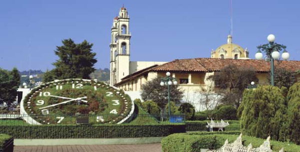 Jardín Principal. Es imprescindible dar un paseo por el jardín principal que luce la Parroquia de San Pedro y San Pablo, y enfrente la iglesia franciscana del mismo nombre, una notable construcción del siglo XVI con planta basilical. Salta a la vista el monumental reloj con dos carátulas opuestas de cinco metros de diámetro cada una, fabricado en los talleres de los descendientes de don León Olvera, iniciador de la empresa Relojes Centenario.