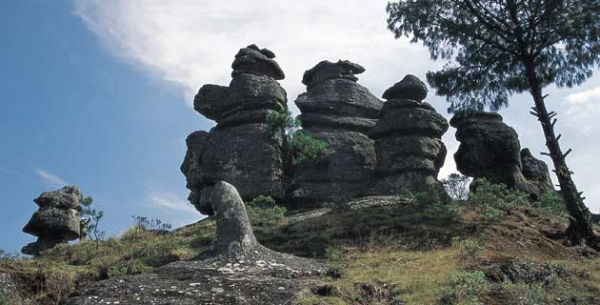 Piedras Encimadas. En torno a ellas gira una leyenda que dice que las rocas son en realidad gigantes cuya maldad fue castigada por un dios prehispánico que los convirtió en piedra. Sin embargo, hoy en día se sabe que tienen unos 65 millones de años de edad y que la actividad volcánica, las reacciones químicas y los agentes atmosféricos como la lluvia, el viento, el sol y la humedad, son factores que con el paso del tiempo y a través de millones de años formaron y moldearon este conjunto escultórico donde puedes encontrar rocas de hasta 20 metros de altura. Las puedes conocer a menos de 25 km de Zacatlán. Allí se pueden realizar largas caminatas por los valles, rentar caballos para recorrer estos extraños parajes, alimentar animales domésticos en una pequeña granja infantil, lanzarse en tirolesa y acampar.